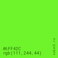 Цвет #6FF42C в цветовой модели RGB обозначается тремя октетами (111, 244, 44) в десятичном формате и #6FF42C в шестнадцатиричном (hex) формате, которые являются интенсивностью красного 111 (hex 6F), интенсивность зелёного 244 (hex F4) и интенсивность синего 44 (hex 2C).