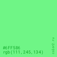 Цвет #6FF586 в цветовой модели RGB обозначается тремя октетами (111, 245, 134) в десятичном формате и #6FF586 в шестнадцатиричном (hex) формате, которые являются интенсивностью красного 111 (hex 6F), интенсивность зелёного 245 (hex F5) и интенсивность синего 134 (hex 86).