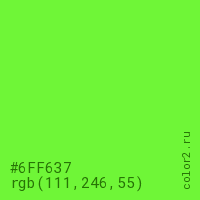 Цвет #6FF637 в цветовой модели RGB обозначается тремя октетами (111, 246, 55) в десятичном формате и #6FF637 в шестнадцатиричном (hex) формате, которые являются интенсивностью красного 111 (hex 6F), интенсивность зелёного 246 (hex F6) и интенсивность синего 55 (hex 37).
