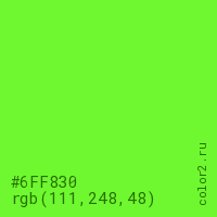 Цвет #6FF830 в цветовой модели RGB обозначается тремя октетами (111, 248, 48) в десятичном формате и #6FF830 в шестнадцатиричном (hex) формате, которые являются интенсивностью красного 111 (hex 6F), интенсивность зелёного 248 (hex F8) и интенсивность синего 48 (hex 30).