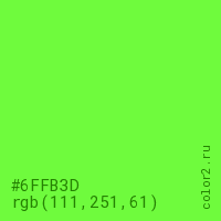 Цвет #6FFB3D в цветовой модели RGB обозначается тремя октетами (111, 251, 61) в десятичном формате и #6FFB3D в шестнадцатиричном (hex) формате, которые являются интенсивностью красного 111 (hex 6F), интенсивность зелёного 251 (hex FB) и интенсивность синего 61 (hex 3D).