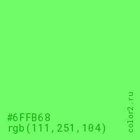 Цвет #6FFB68 в цветовой модели RGB обозначается тремя октетами (111, 251, 104) в десятичном формате и #6FFB68 в шестнадцатиричном (hex) формате, которые являются интенсивностью красного 111 (hex 6F), интенсивность зелёного 251 (hex FB) и интенсивность синего 104 (hex 68).