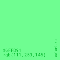 Цвет #6FFD91 в цветовой модели RGB обозначается тремя октетами (111, 253, 145) в десятичном формате и #6FFD91 в шестнадцатиричном (hex) формате, которые являются интенсивностью красного 111 (hex 6F), интенсивность зелёного 253 (hex FD) и интенсивность синего 145 (hex 91).