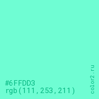 Цвет #6FFDD3 в цветовой модели RGB обозначается тремя октетами (111, 253, 211) в десятичном формате и #6FFDD3 в шестнадцатиричном (hex) формате, которые являются интенсивностью красного 111 (hex 6F), интенсивность зелёного 253 (hex FD) и интенсивность синего 211 (hex D3).