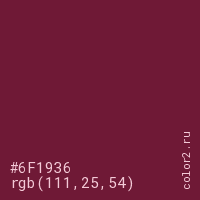 Цвет #6F1936 в цветовой модели RGB обозначается тремя октетами (111, 25, 54) в десятичном формате и #6F1936 в шестнадцатиричном (hex) формате, которые являются интенсивностью красного 111 (hex 6F), интенсивность зелёного 25 (hex 19) и интенсивность синего 54 (hex 36).