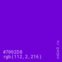 Цвет #7002D8 в цветовой модели RGB обозначается тремя октетами (112, 2, 216) в десятичном формате и #7002D8 в шестнадцатиричном (hex) формате, которые являются интенсивностью красного 112 (hex 70), интенсивность зелёного 2 (hex 02) и интенсивность синего 216 (hex D8).