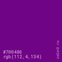 Цвет #700486 в цветовой модели RGB обозначается тремя октетами (112, 4, 134) в десятичном формате и #700486 в шестнадцатиричном (hex) формате, которые являются интенсивностью красного 112 (hex 70), интенсивность зелёного 4 (hex 04) и интенсивность синего 134 (hex 86).