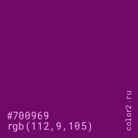 Цвет #700969 в цветовой модели RGB обозначается тремя октетами (112, 9, 105) в десятичном формате и #700969 в шестнадцатиричном (hex) формате, которые являются интенсивностью красного 112 (hex 70), интенсивность зелёного 9 (hex 09) и интенсивность синего 105 (hex 69).