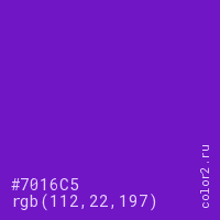 Цвет #7016C5 в цветовой модели RGB обозначается тремя октетами (112, 22, 197) в десятичном формате и #7016C5 в шестнадцатиричном (hex) формате, которые являются интенсивностью красного 112 (hex 70), интенсивность зелёного 22 (hex 16) и интенсивность синего 197 (hex C5).