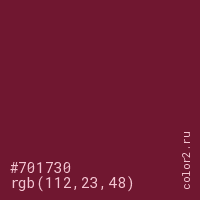 Цвет #701730 в цветовой модели RGB обозначается тремя октетами (112, 23, 48) в десятичном формате и #701730 в шестнадцатиричном (hex) формате, которые являются интенсивностью красного 112 (hex 70), интенсивность зелёного 23 (hex 17) и интенсивность синего 48 (hex 30).