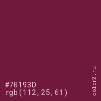 Цвет #70193D в цветовой модели RGB обозначается тремя октетами (112, 25, 61) в десятичном формате и #70193D в шестнадцатиричном (hex) формате, которые являются интенсивностью красного 112 (hex 70), интенсивность зелёного 25 (hex 19) и интенсивность синего 61 (hex 3D).