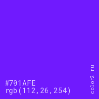 Цвет #701AFE в цветовой модели RGB обозначается тремя октетами (112, 26, 254) в десятичном формате и #701AFE в шестнадцатиричном (hex) формате, которые являются интенсивностью красного 112 (hex 70), интенсивность зелёного 26 (hex 1A) и интенсивность синего 254 (hex FE).