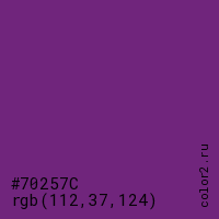 Цвет #70257C в цветовой модели RGB обозначается тремя октетами (112, 37, 124) в десятичном формате и #70257C в шестнадцатиричном (hex) формате, которые являются интенсивностью красного 112 (hex 70), интенсивность зелёного 37 (hex 25) и интенсивность синего 124 (hex 7C).
