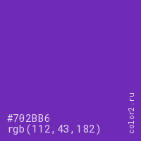 Цвет #702BB6 в цветовой модели RGB обозначается тремя октетами (112, 43, 182) в десятичном формате и #702BB6 в шестнадцатиричном (hex) формате, которые являются интенсивностью красного 112 (hex 70), интенсивность зелёного 43 (hex 2B) и интенсивность синего 182 (hex B6).