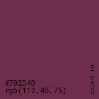 Цвет #702D4B в цветовой модели RGB обозначается тремя октетами (112, 45, 75) в десятичном формате и #702D4B в шестнадцатиричном (hex) формате, которые являются интенсивностью красного 112 (hex 70), интенсивность зелёного 45 (hex 2D) и интенсивность синего 75 (hex 4B).