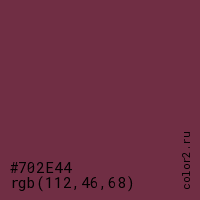 Цвет #702E44 в цветовой модели RGB обозначается тремя октетами (112, 46, 68) в десятичном формате и #702E44 в шестнадцатиричном (hex) формате, которые являются интенсивностью красного 112 (hex 70), интенсивность зелёного 46 (hex 2E) и интенсивность синего 68 (hex 44).