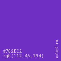 Цвет #702EC2 в цветовой модели RGB обозначается тремя октетами (112, 46, 194) в десятичном формате и #702EC2 в шестнадцатиричном (hex) формате, которые являются интенсивностью красного 112 (hex 70), интенсивность зелёного 46 (hex 2E) и интенсивность синего 194 (hex C2).