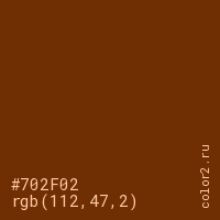 Цвет #702F02 в цветовой модели RGB обозначается тремя октетами (112, 47, 2) в десятичном формате и #702F02 в шестнадцатиричном (hex) формате, которые являются интенсивностью красного 112 (hex 70), интенсивность зелёного 47 (hex 2F) и интенсивность синего 2 (hex 02).