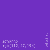Цвет #702FC2 в цветовой модели RGB обозначается тремя октетами (112, 47, 194) в десятичном формате и #702FC2 в шестнадцатиричном (hex) формате, которые являются интенсивностью красного 112 (hex 70), интенсивность зелёного 47 (hex 2F) и интенсивность синего 194 (hex C2).