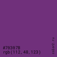 Цвет #70307B в цветовой модели RGB обозначается тремя октетами (112, 48, 123) в десятичном формате и #70307B в шестнадцатиричном (hex) формате, которые являются интенсивностью красного 112 (hex 70), интенсивность зелёного 48 (hex 30) и интенсивность синего 123 (hex 7B).