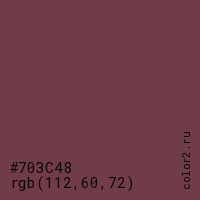Цвет #703C48 в цветовой модели RGB обозначается тремя октетами (112, 60, 72) в десятичном формате и #703C48 в шестнадцатиричном (hex) формате, которые являются интенсивностью красного 112 (hex 70), интенсивность зелёного 60 (hex 3C) и интенсивность синего 72 (hex 48).