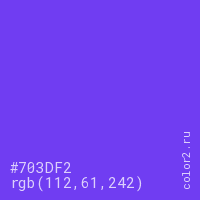 Цвет #703DF2 в цветовой модели RGB обозначается тремя октетами (112, 61, 242) в десятичном формате и #703DF2 в шестнадцатиричном (hex) формате, которые являются интенсивностью красного 112 (hex 70), интенсивность зелёного 61 (hex 3D) и интенсивность синего 242 (hex F2).