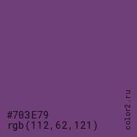 Цвет #703E79 в цветовой модели RGB обозначается тремя октетами (112, 62, 121) в десятичном формате и #703E79 в шестнадцатиричном (hex) формате, которые являются интенсивностью красного 112 (hex 70), интенсивность зелёного 62 (hex 3E) и интенсивность синего 121 (hex 79).