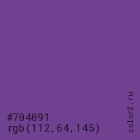 Цвет #704091 в цветовой модели RGB обозначается тремя октетами (112, 64, 145) в десятичном формате и #704091 в шестнадцатиричном (hex) формате, которые являются интенсивностью красного 112 (hex 70), интенсивность зелёного 64 (hex 40) и интенсивность синего 145 (hex 91).