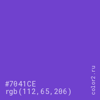 Цвет #7041CE в цветовой модели RGB обозначается тремя октетами (112, 65, 206) в десятичном формате и #7041CE в шестнадцатиричном (hex) формате, которые являются интенсивностью красного 112 (hex 70), интенсивность зелёного 65 (hex 41) и интенсивность синего 206 (hex CE).