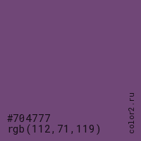Цвет #704777 в цветовой модели RGB обозначается тремя октетами (112, 71, 119) в десятичном формате и #704777 в шестнадцатиричном (hex) формате, которые являются интенсивностью красного 112 (hex 70), интенсивность зелёного 71 (hex 47) и интенсивность синего 119 (hex 77).