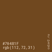 Цвет #70481F в цветовой модели RGB обозначается тремя октетами (112, 72, 31) в десятичном формате и #70481F в шестнадцатиричном (hex) формате, которые являются интенсивностью красного 112 (hex 70), интенсивность зелёного 72 (hex 48) и интенсивность синего 31 (hex 1F).
