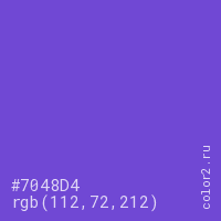 Цвет #7048D4 в цветовой модели RGB обозначается тремя октетами (112, 72, 212) в десятичном формате и #7048D4 в шестнадцатиричном (hex) формате, которые являются интенсивностью красного 112 (hex 70), интенсивность зелёного 72 (hex 48) и интенсивность синего 212 (hex D4).