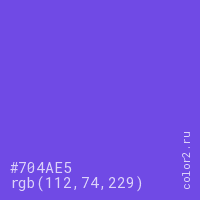Цвет #704AE5 в цветовой модели RGB обозначается тремя октетами (112, 74, 229) в десятичном формате и #704AE5 в шестнадцатиричном (hex) формате, которые являются интенсивностью красного 112 (hex 70), интенсивность зелёного 74 (hex 4A) и интенсивность синего 229 (hex E5).