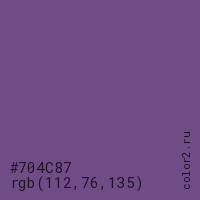 Цвет #704C87 в цветовой модели RGB обозначается тремя октетами (112, 76, 135) в десятичном формате и #704C87 в шестнадцатиричном (hex) формате, которые являются интенсивностью красного 112 (hex 70), интенсивность зелёного 76 (hex 4C) и интенсивность синего 135 (hex 87).