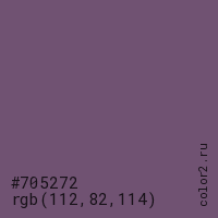 Цвет #705272 в цветовой модели RGB обозначается тремя октетами (112, 82, 114) в десятичном формате и #705272 в шестнадцатиричном (hex) формате, которые являются интенсивностью красного 112 (hex 70), интенсивность зелёного 82 (hex 52) и интенсивность синего 114 (hex 72).