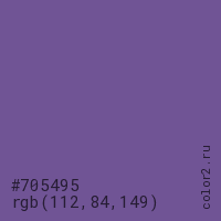 Цвет #705495 в цветовой модели RGB обозначается тремя октетами (112, 84, 149) в десятичном формате и #705495 в шестнадцатиричном (hex) формате, которые являются интенсивностью красного 112 (hex 70), интенсивность зелёного 84 (hex 54) и интенсивность синего 149 (hex 95).