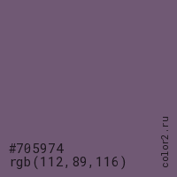 Цвет #705974 в цветовой модели RGB обозначается тремя октетами (112, 89, 116) в десятичном формате и #705974 в шестнадцатиричном (hex) формате, которые являются интенсивностью красного 112 (hex 70), интенсивность зелёного 89 (hex 59) и интенсивность синего 116 (hex 74).