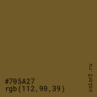 Цвет #705A27 в цветовой модели RGB обозначается тремя октетами (112, 90, 39) в десятичном формате и #705A27 в шестнадцатиричном (hex) формате, которые являются интенсивностью красного 112 (hex 70), интенсивность зелёного 90 (hex 5A) и интенсивность синего 39 (hex 27).