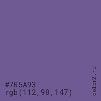 Цвет #705A93 в цветовой модели RGB обозначается тремя октетами (112, 90, 147) в десятичном формате и #705A93 в шестнадцатиричном (hex) формате, которые являются интенсивностью красного 112 (hex 70), интенсивность зелёного 90 (hex 5A) и интенсивность синего 147 (hex 93).