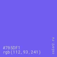 Цвет #705DF1 в цветовой модели RGB обозначается тремя октетами (112, 93, 241) в десятичном формате и #705DF1 в шестнадцатиричном (hex) формате, которые являются интенсивностью красного 112 (hex 70), интенсивность зелёного 93 (hex 5D) и интенсивность синего 241 (hex F1).