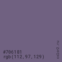 Цвет #706181 в цветовой модели RGB обозначается тремя октетами (112, 97, 129) в десятичном формате и #706181 в шестнадцатиричном (hex) формате, которые являются интенсивностью красного 112 (hex 70), интенсивность зелёного 97 (hex 61) и интенсивность синего 129 (hex 81).