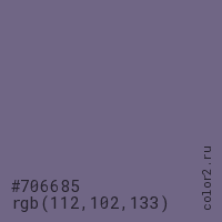 Цвет #706685 в цветовой модели RGB обозначается тремя октетами (112, 102, 133) в десятичном формате и #706685 в шестнадцатиричном (hex) формате, которые являются интенсивностью красного 112 (hex 70), интенсивность зелёного 102 (hex 66) и интенсивность синего 133 (hex 85).