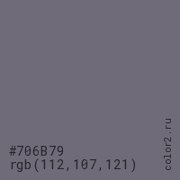 Цвет #706B79 в цветовой модели RGB обозначается тремя октетами (112, 107, 121) в десятичном формате и #706B79 в шестнадцатиричном (hex) формате, которые являются интенсивностью красного 112 (hex 70), интенсивность зелёного 107 (hex 6B) и интенсивность синего 121 (hex 79).