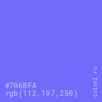 Цвет #706BFA в цветовой модели RGB обозначается тремя октетами (112, 107, 250) в десятичном формате и #706BFA в шестнадцатиричном (hex) формате, которые являются интенсивностью красного 112 (hex 70), интенсивность зелёного 107 (hex 6B) и интенсивность синего 250 (hex FA).