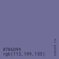 Цвет #706D99 в цветовой модели RGB обозначается тремя октетами (112, 109, 153) в десятичном формате и #706D99 в шестнадцатиричном (hex) формате, которые являются интенсивностью красного 112 (hex 70), интенсивность зелёного 109 (hex 6D) и интенсивность синего 153 (hex 99).