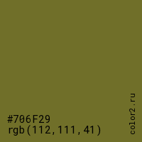 Цвет #706F29 в цветовой модели RGB обозначается тремя октетами (112, 111, 41) в десятичном формате и #706F29 в шестнадцатиричном (hex) формате, которые являются интенсивностью красного 112 (hex 70), интенсивность зелёного 111 (hex 6F) и интенсивность синего 41 (hex 29).