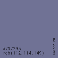 Цвет #707295 в цветовой модели RGB обозначается тремя октетами (112, 114, 149) в десятичном формате и #707295 в шестнадцатиричном (hex) формате, которые являются интенсивностью красного 112 (hex 70), интенсивность зелёного 114 (hex 72) и интенсивность синего 149 (hex 95).