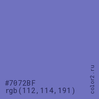 Цвет #7072BF в цветовой модели RGB обозначается тремя октетами (112, 114, 191) в десятичном формате и #7072BF в шестнадцатиричном (hex) формате, которые являются интенсивностью красного 112 (hex 70), интенсивность зелёного 114 (hex 72) и интенсивность синего 191 (hex BF).