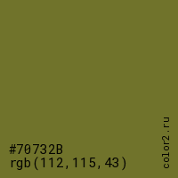 Цвет #70732B в цветовой модели RGB обозначается тремя октетами (112, 115, 43) в десятичном формате и #70732B в шестнадцатиричном (hex) формате, которые являются интенсивностью красного 112 (hex 70), интенсивность зелёного 115 (hex 73) и интенсивность синего 43 (hex 2B).
