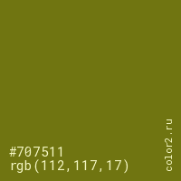 Цвет #707511 в цветовой модели RGB обозначается тремя октетами (112, 117, 17) в десятичном формате и #707511 в шестнадцатиричном (hex) формате, которые являются интенсивностью красного 112 (hex 70), интенсивность зелёного 117 (hex 75) и интенсивность синего 17 (hex 11).